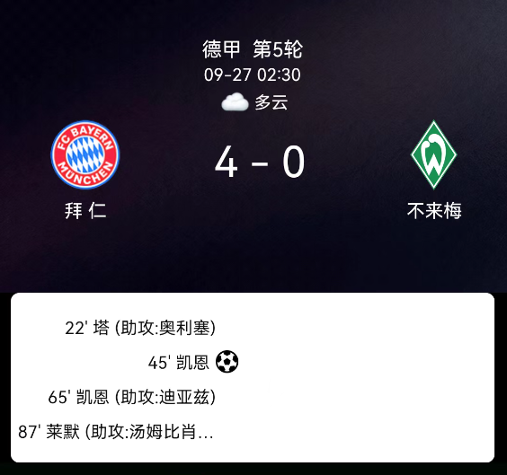 北京时间9月27日2:30,德国足球甲级联赛(德甲)第5轮,拜仁慕尼黑坐镇慕尼黑安联球场迎战不莱梅。主队上半场确立两球优势,下半场凯恩完成双响并解锁拜仁生涯百球里程碑,终场前再添一球锁定大胜,最终比分,拜仁慕…