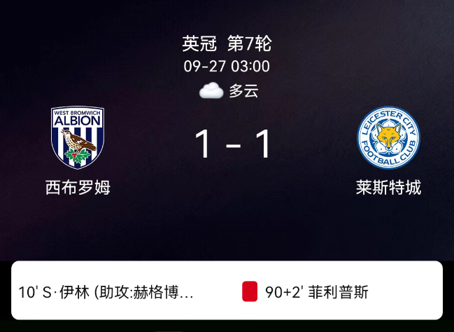 北京时间9月27日英格兰足球冠军联赛(英冠)第7轮,西布朗坐镇主场迎战莱斯特城。西布朗开场迅速破门建立优势,却在补时阶段因自摆乌龙被扳平,最终双方握手言和,最终比分,西布朗1-1莱斯特城。关键事件第10分钟(进…