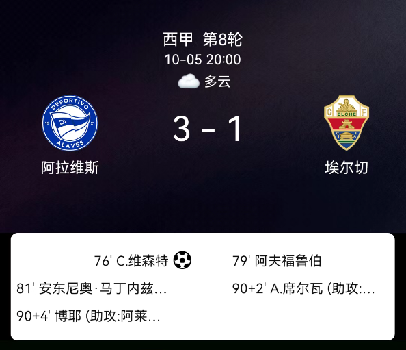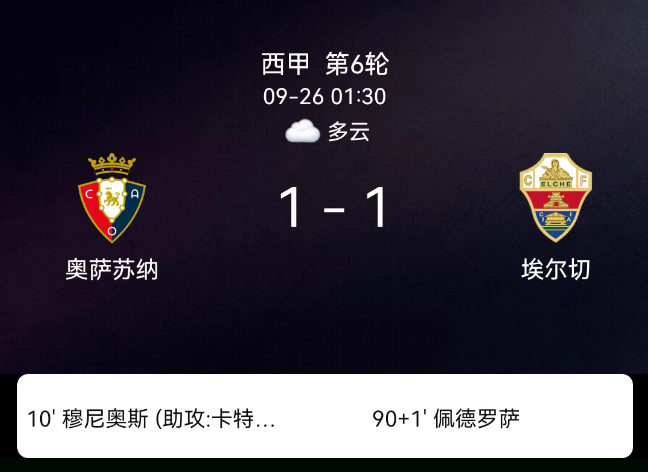 北京时间9月26日,西班牙足球甲级联赛第6轮,奥萨苏纳主场对阵埃尔切。双方在下半场经历戏剧性转折,埃尔切10人应战仍顽强扳平,最终比分,奥萨苏纳1-1埃尔切。关键事件第10分钟(进球):奥萨苏纳取得领先!卡泰纳边…