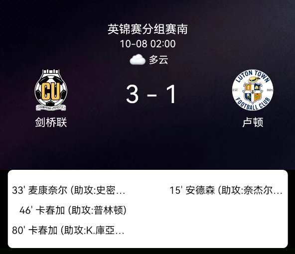 北京时间10月8日,英格兰联赛锦标赛小组赛南区,卡迪夫城主场迎战纽波特。第25分钟卡迪夫城球员因中场拼抢犯规先吃黄牌,第38分钟纽波特后卫拦截动作过大领黄;上半场临近尾声,第43分钟卡伊-惠特莫尔送出助攻,汤姆…