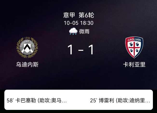 北京时间10月5日,意大利足球顶级联赛第6轮,乌迪内斯主场迎战卡利亚里。上半场第25分钟,卡利亚里阿多波助攻博雷利破门先拔头筹;下半场第58分钟,乌迪内斯索莱-博马沃科助攻卡巴瑟利破门扳平,双方后续均未改写比分…