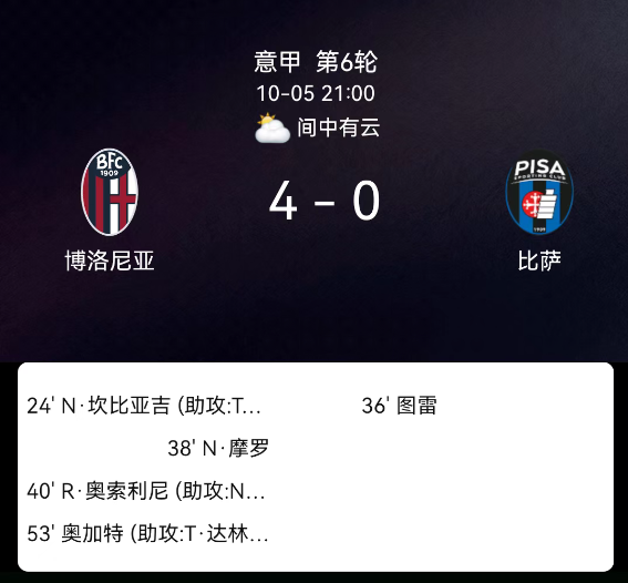 北京时间10月5日,意大利足球顶级联赛第6轮,博洛尼亚主场迎战比萨。第24分钟达林加助攻坎比亚吉破门为博洛尼亚首开纪录,第36分钟比萨伊德里萨-图雷染红离场;第38分钟莫罗破门扩大比分,第40分钟坎比亚吉助攻奥尔索…